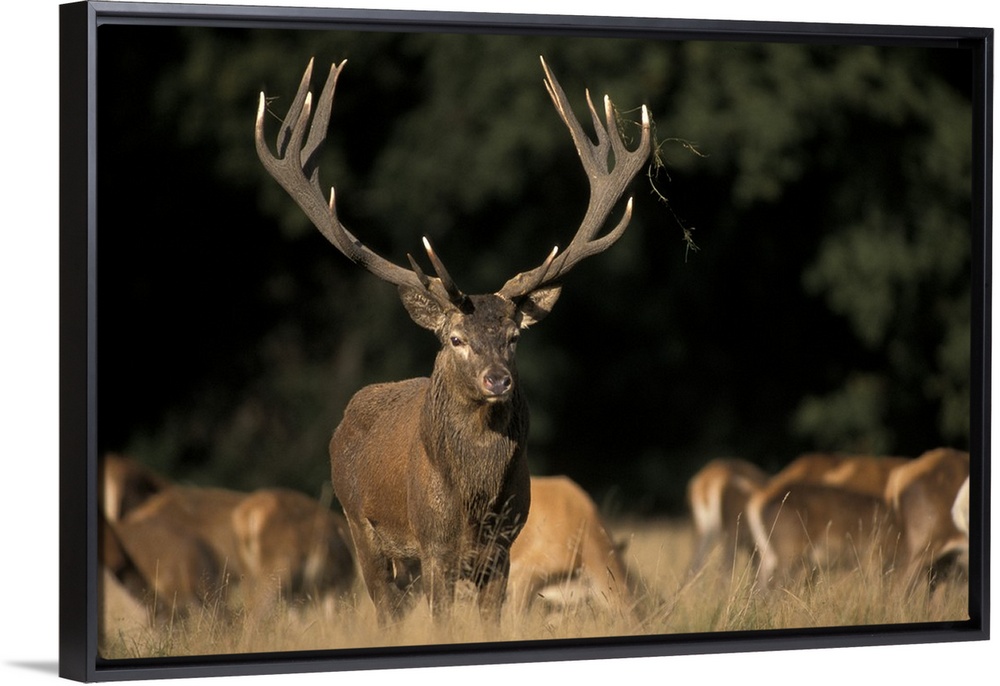 <p>Oversized, horizontal photograph of a large deer with giant antlers, looking at the camera, while the rest of the herd is slightly out of focus, grazing in the meadow at the edge of the forest.</p>