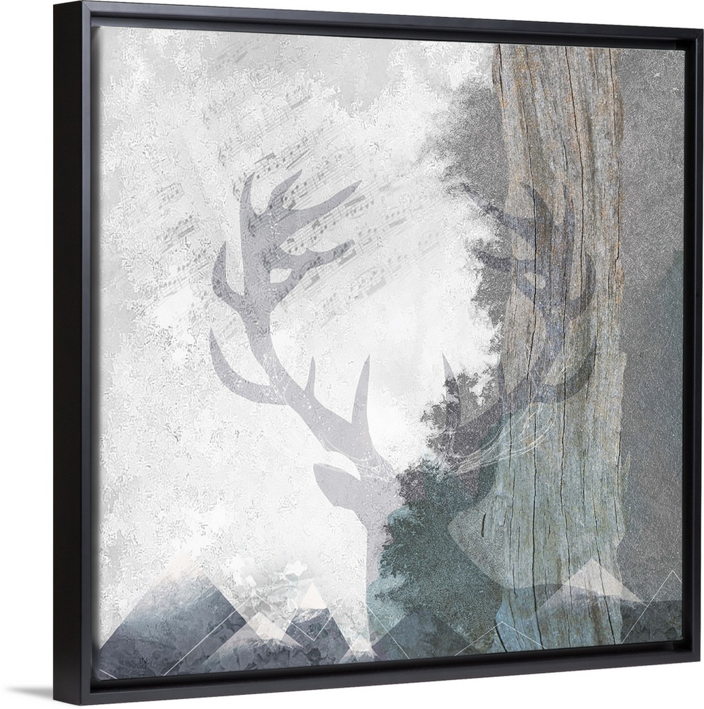 <p>Contemporary artwork of a faded illustration of a stag against a distressed background of wilderness imagery.</p>
