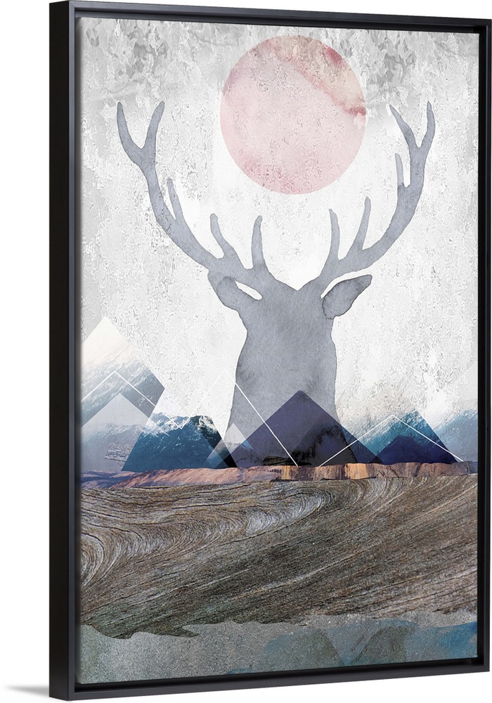 <p>Contemporary artwork of a faded illustration of a stag against a distressed background of wilderness imagery.</p>