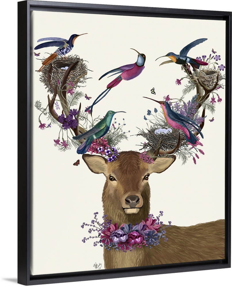 <p>Digital illustration of a buck wearing flowers around his neck and on his antlers along with tropical birds and their nest.</p>
