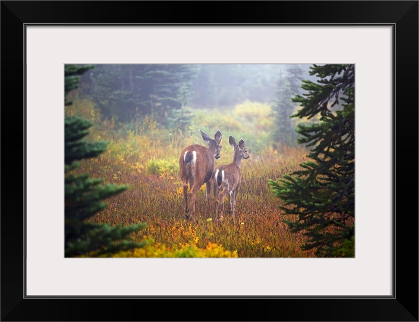 <p>Two deer are photographed from behind standing in a grassy field with a layer of fog shown in the distance.</p>