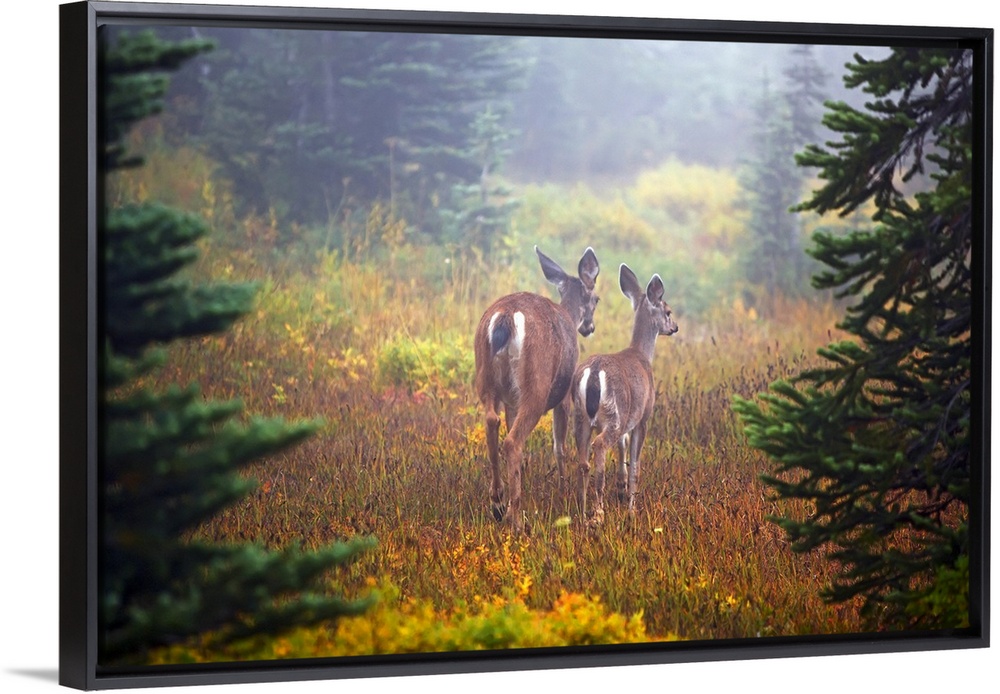 <p>Two deer are photographed from behind standing in a grassy field with a layer of fog shown in the distance.</p>