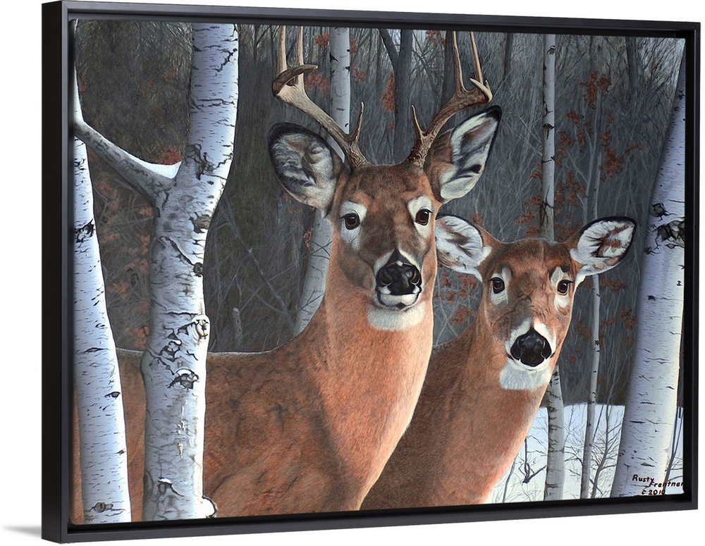 <p>Contemporary painting of a deer couple standing beside a tree in a forest in winter.</p>