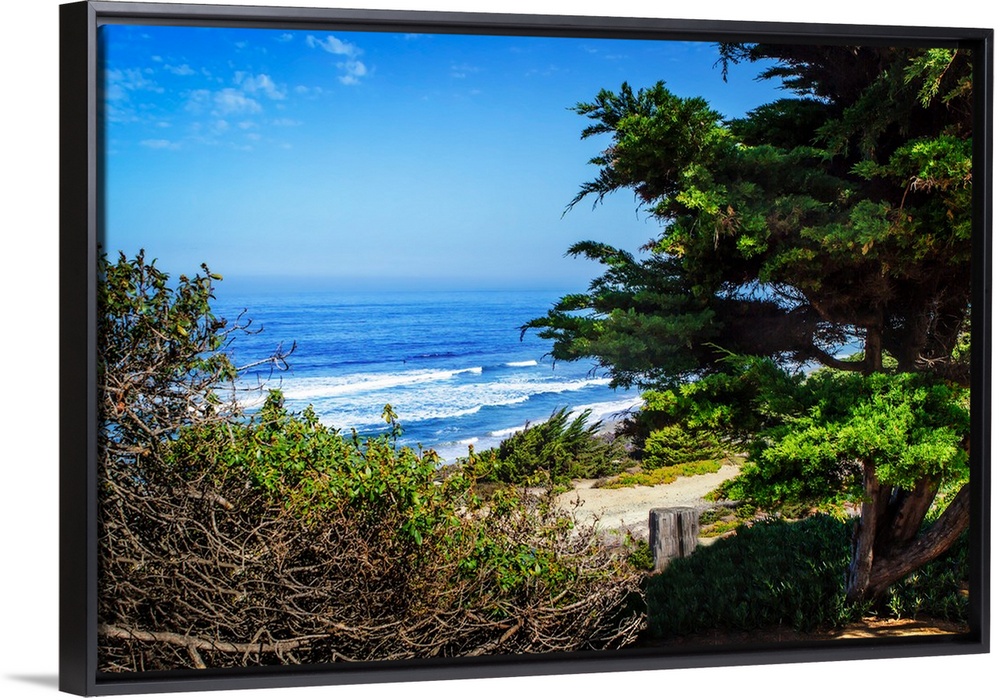 <p>Landscape photograph of the Pacific Ocean and shore from behind green coastal vegetation.</p>