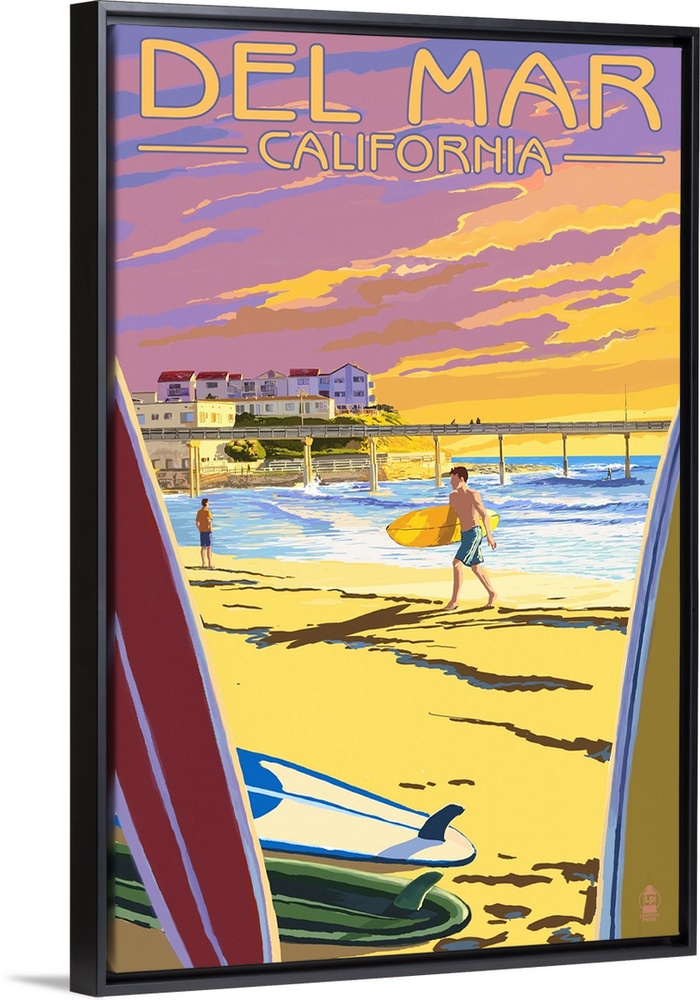 <p>Retro stylized art poster of a surfer on a beach with a pier in the background. Viewed through a pair of surfboards along the edges of the image.</p>