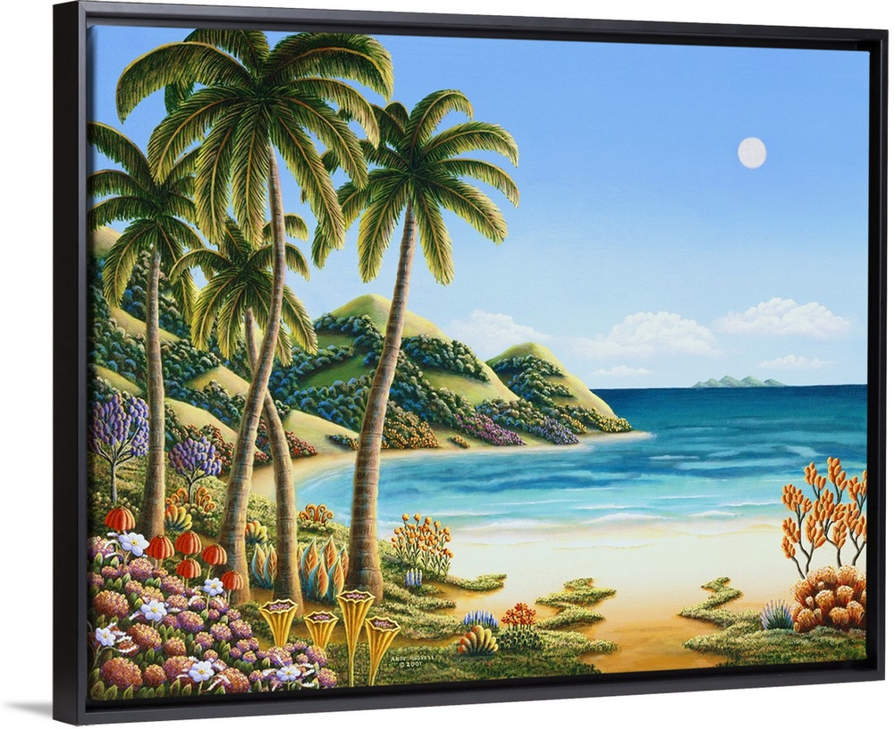 <p>Painting of a tropical paradise with lush vibrant foliage all around.</p>