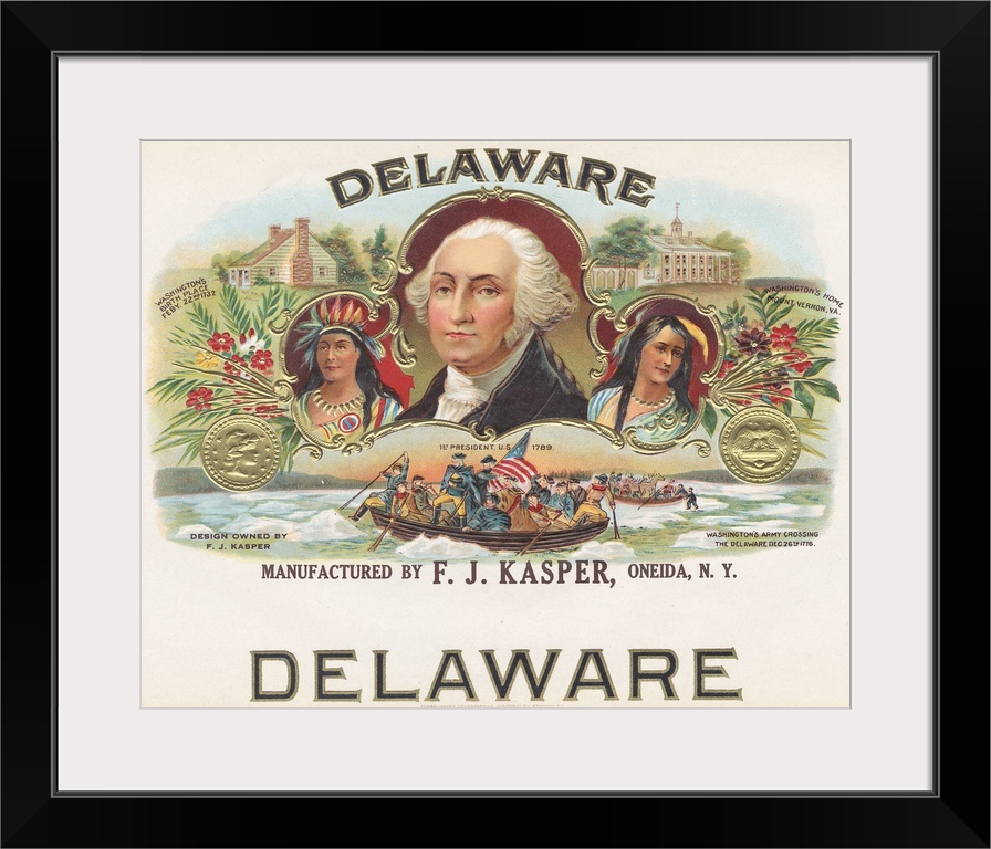 <p>Delaware. Manufactured by F.J. Kasper, Oneida, N.Y.? President Washington with an indian on his left and right side, to his top left is his Birth place to his bottom left is his home, and under him are soldiers in a boat with an American flag.</p>