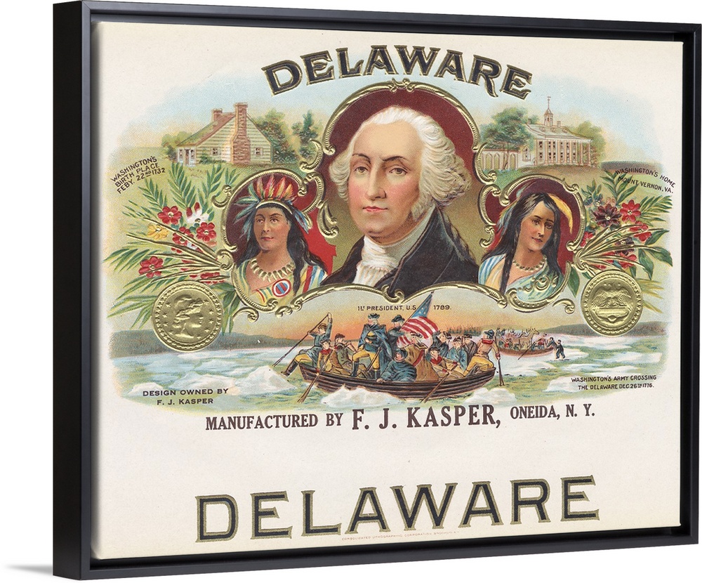 <p>Delaware. Manufactured by F.J. Kasper, Oneida, N.Y.? President Washington with an indian on his left and right side, to his top left is his Birth place to his bottom left is his home, and under him are soldiers in a boat with an American flag.</p>