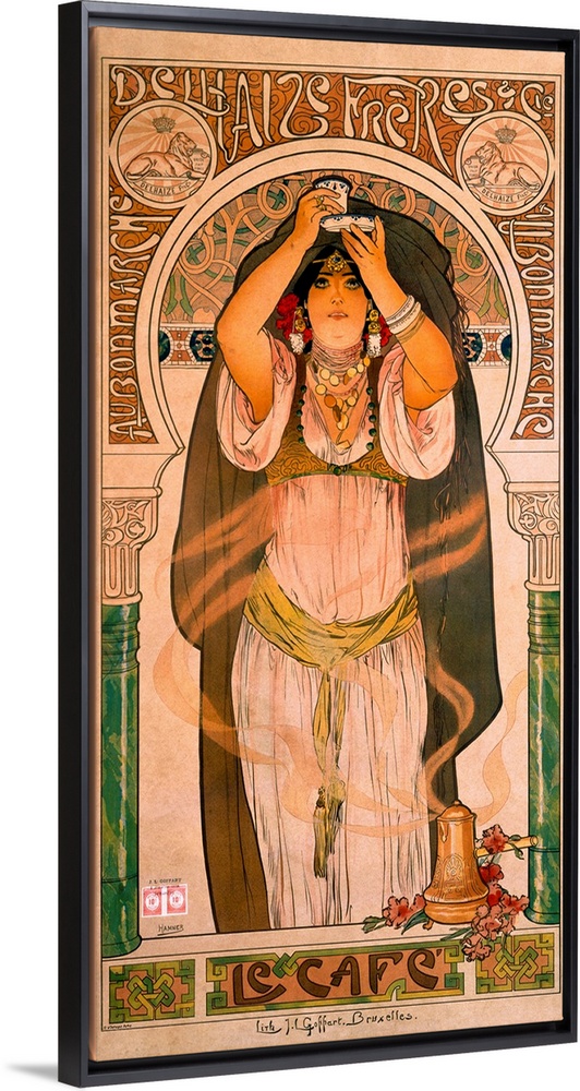 <p>Lady holding up plate and cup. A sumptuous design for Delhaize Brothers coffee that wallows in the orientalism so prevalent during the waning days of the 19th-century with hypnotic results. The steaming tendrils of the freshly brewed beans wrap about the young Arabic beauty as she reverentially hoists her morning cup, Byzantine detail combining with Art Nouveau indulgence to mesmerizing perfection. Hamner, the graphic pseudonym of portrait painter Herman Richir, produced many posters, a great deal of them created for the Brussels firm of Delhaize Freres. He studied at the Academy of Fine Arts at Saint-Josse-ten-Noode in Brussels, and later taught at the Brussels Fine Arts Academy, also serving as the schools director.</p>