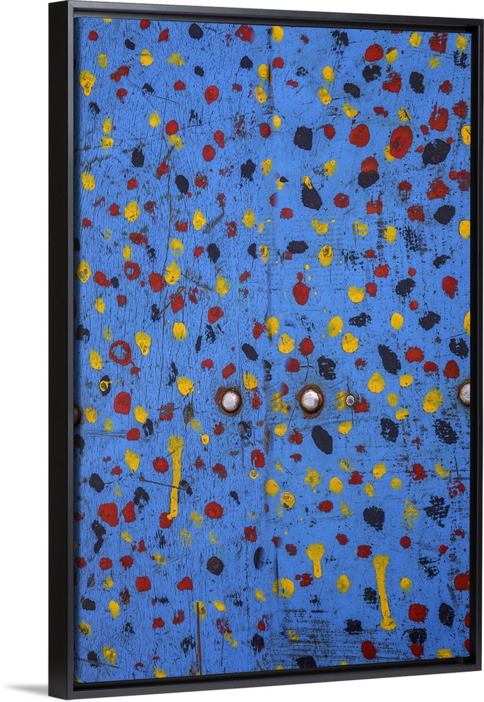 <p>Abstract artwork of yellow and red dots splattered on blue doors.</p>