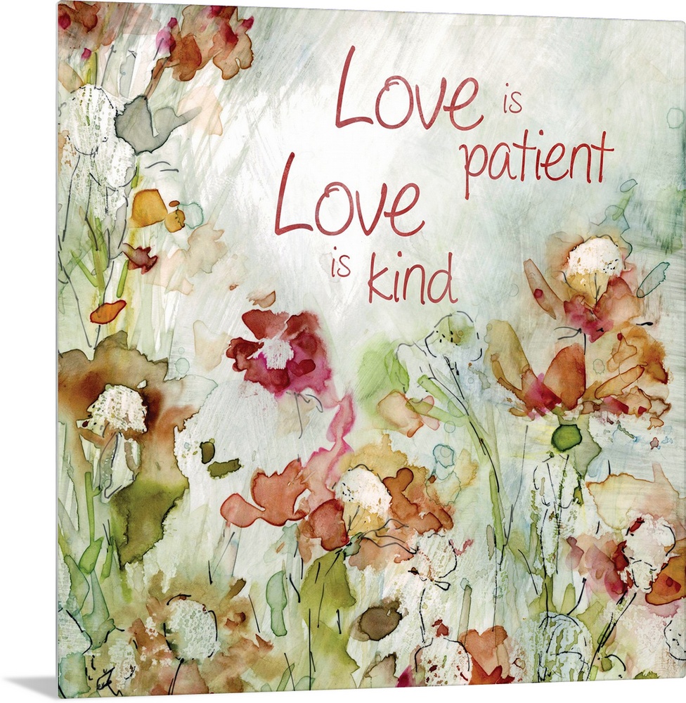<p>Decorative watercolor artwork of a group of flowers with the text "Love is Patient, Love is Kind".</p>