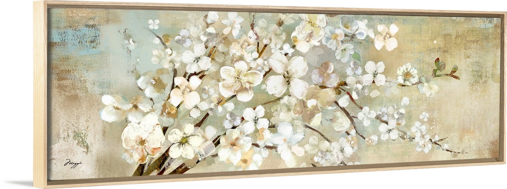 <p>A panoramic painting of a branch of white blossoms against a neutral backdrop.</p>