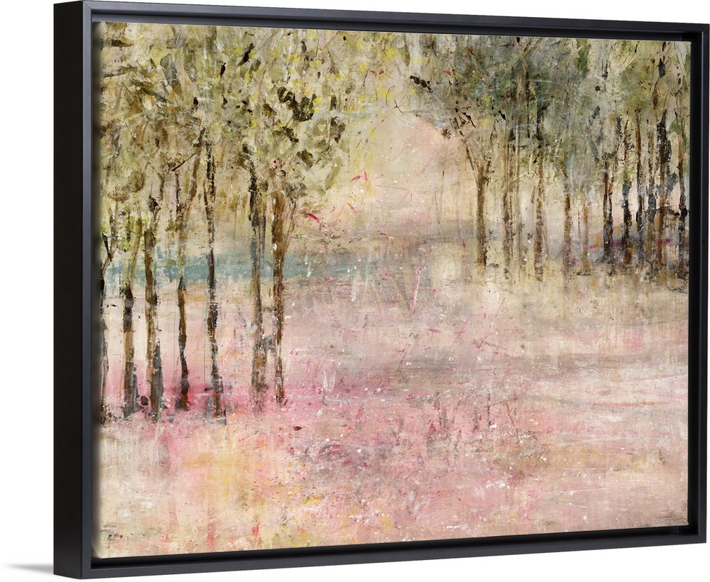 <p>Contemporary painting of trees lining a a clearing in shades of pale pink.</p>