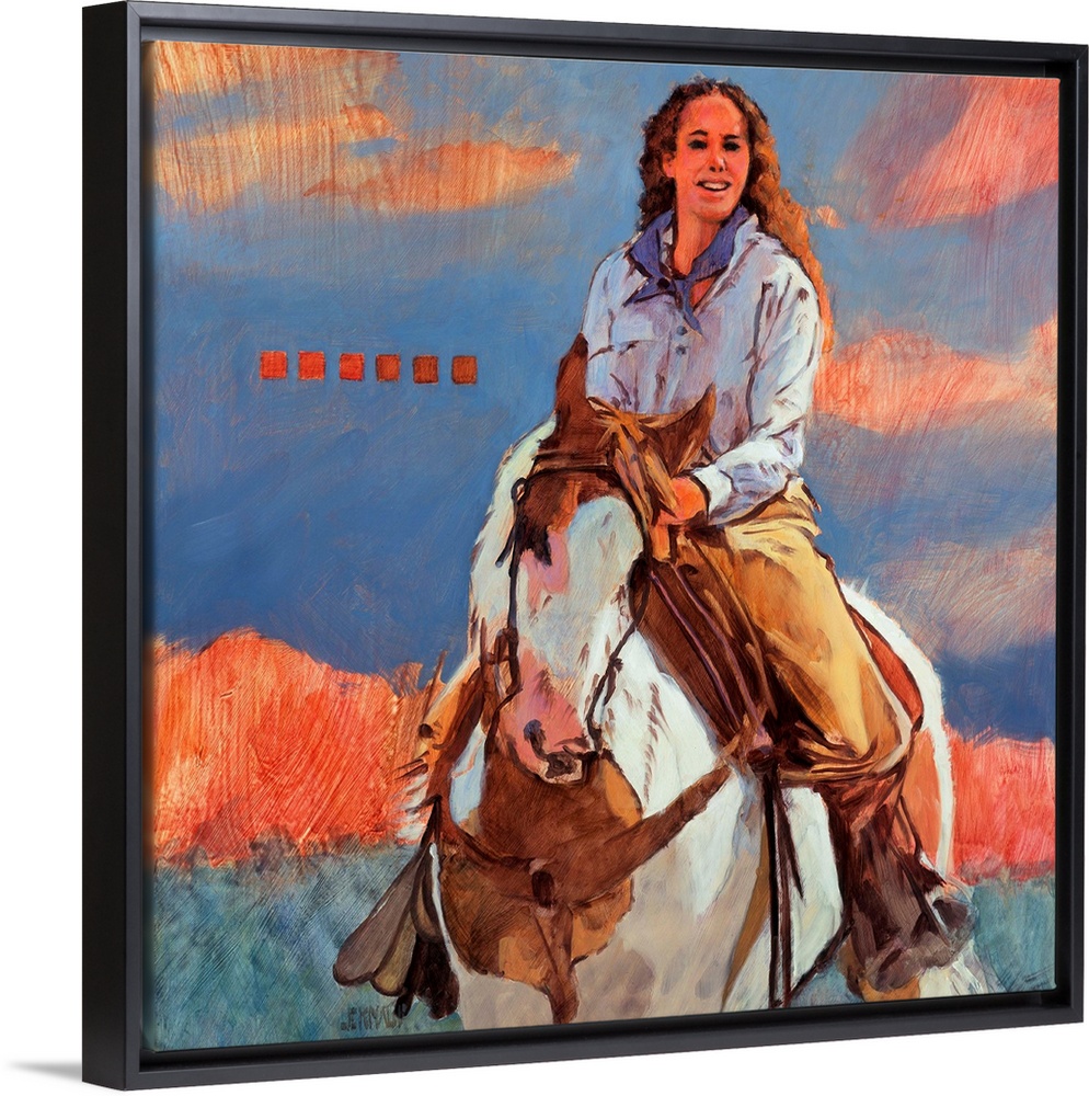 <p>Contemporary western theme painting of a cowgirl on horseback.</p>