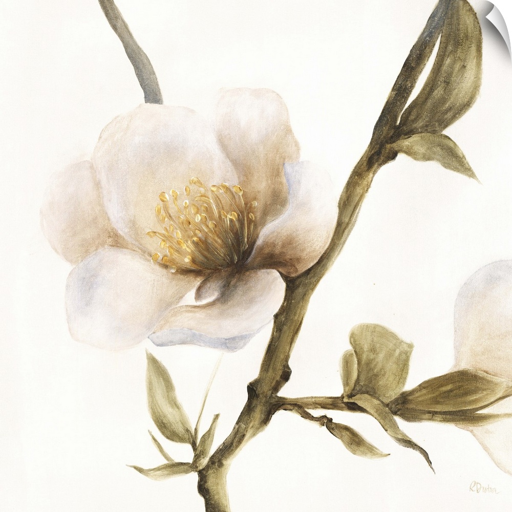 <p>Contemporary painting of a white flower on a leafy stem.</p>