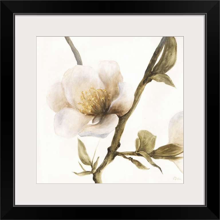 <p>Contemporary painting of a white flower on a leafy stem.</p>