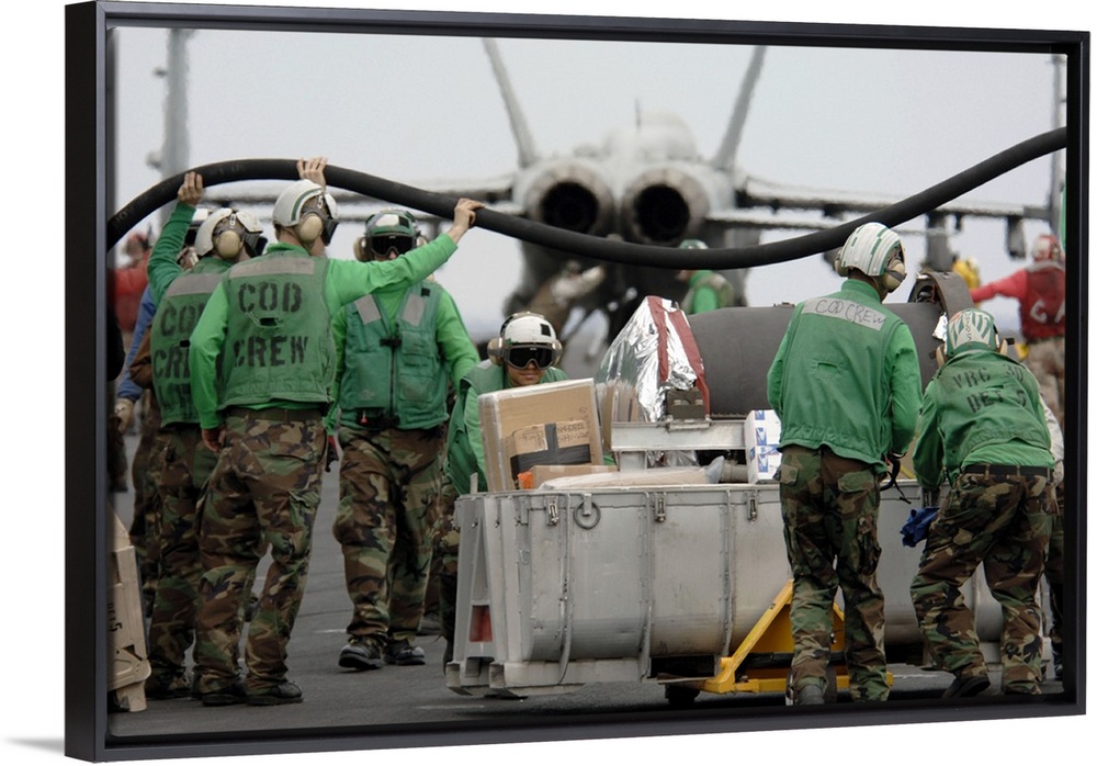 <p>Delivery crew lift a fuel hose to help other Sailors move mail and supplies across the flight deck.</p>