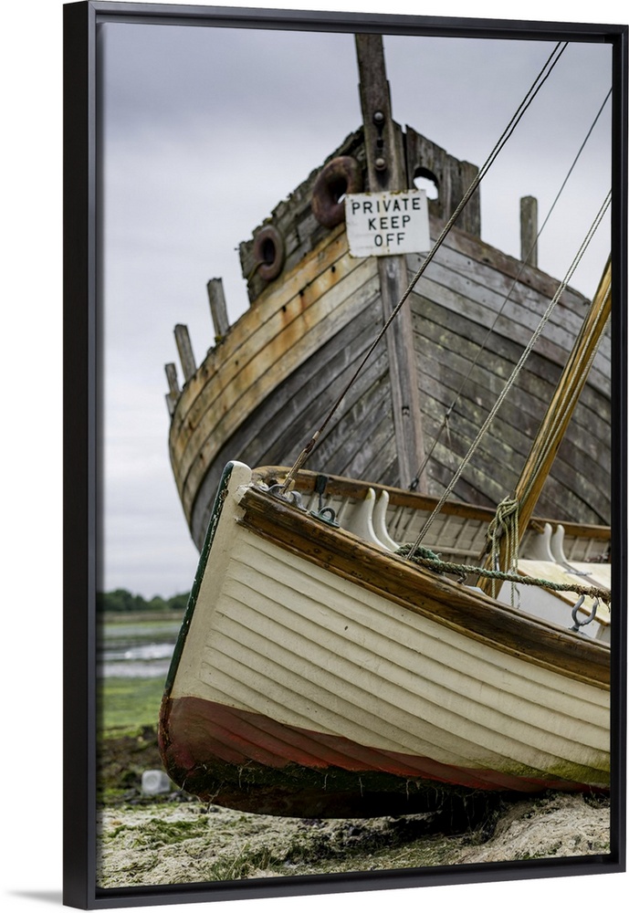 <p>A small sailing dinghy beside a large rotting hulk of a boat.</p>