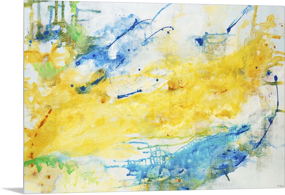 <p>A contemporary abstract painting using predominantly yellow with splashes of blue.</p>