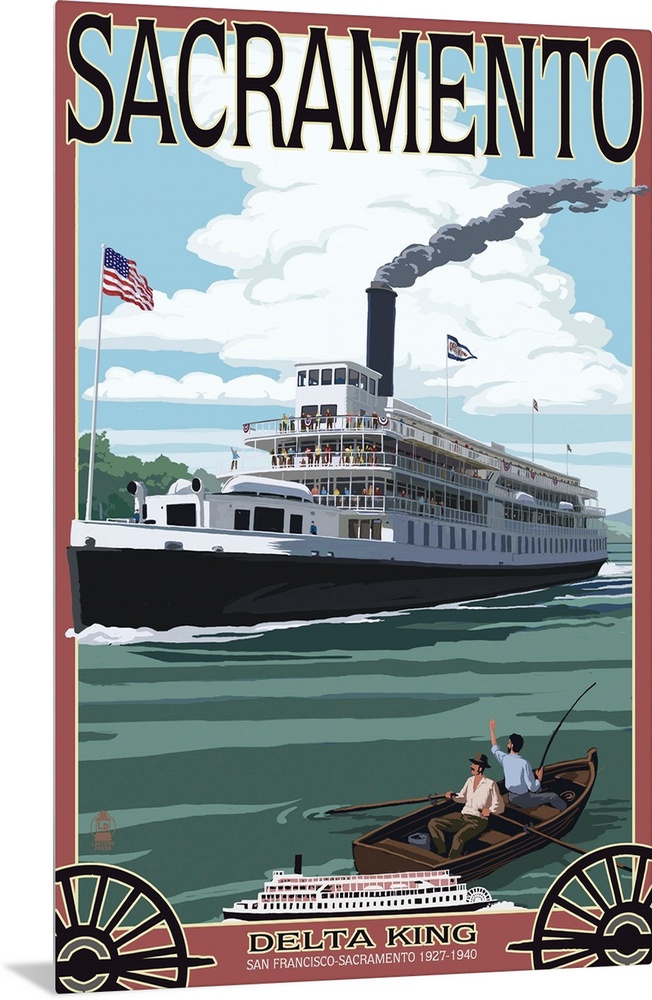 <p>Retro stylized art poster of a riverboat with smoke pouring out of the smokestack.</p>