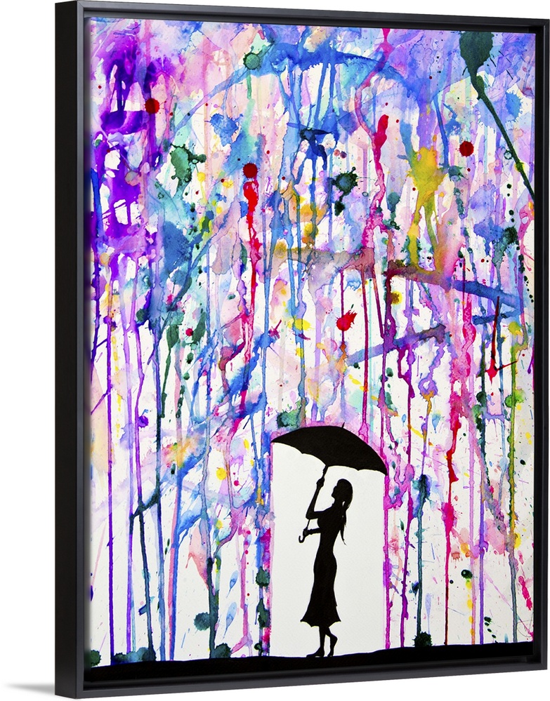 <p>Watercolor and ink painting of a silhouetted woman with an umbrella under colorful rain.</p>