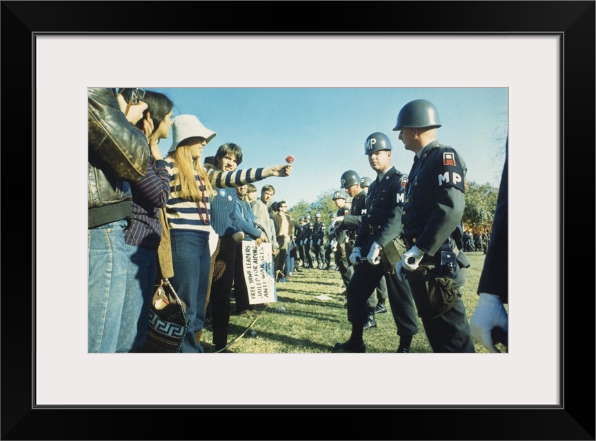 <p>Female demonstrator offers a flower to military police during the 1967 March on the Pentagon. 50,000 Anti-Vietnam War demonstrators were led by Abbie Hoffman and marched from the Lincoln Memorial to The Pentagon on Oct. 21, 1967.</p>