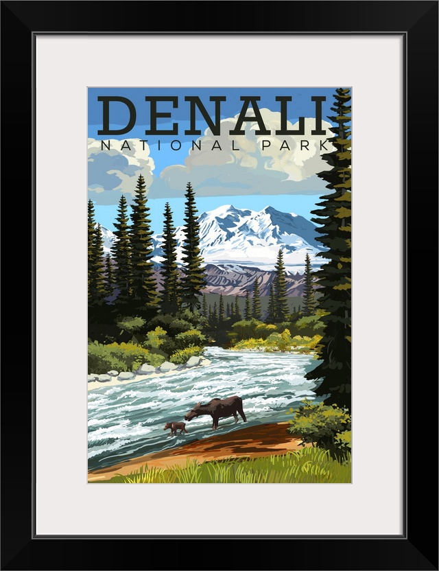 Art Mountains Lantern Press United States Alaska Denali National Park Wildlife Moose and Elk