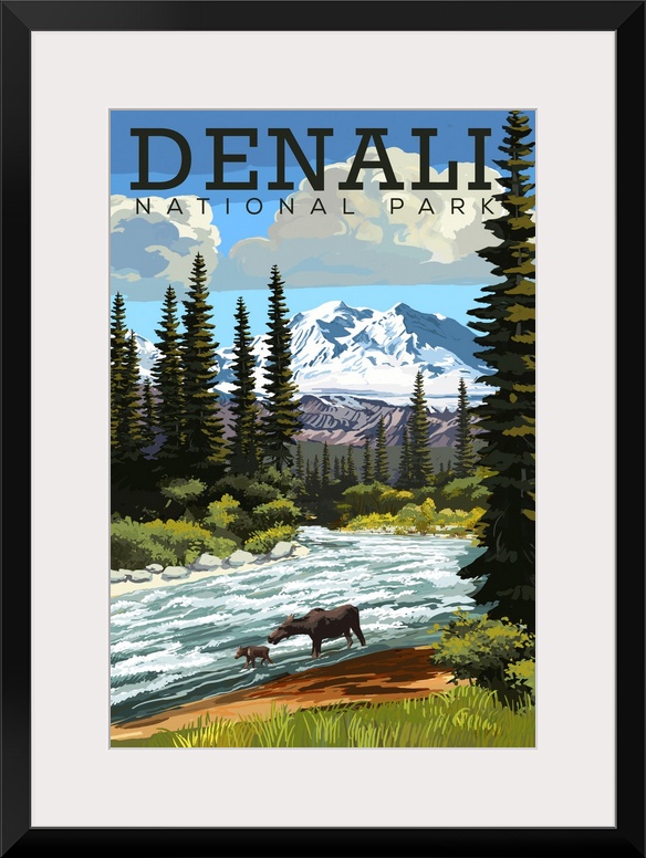 Art Mountains Lantern Press United States Alaska Denali National Park Wildlife Moose and Elk