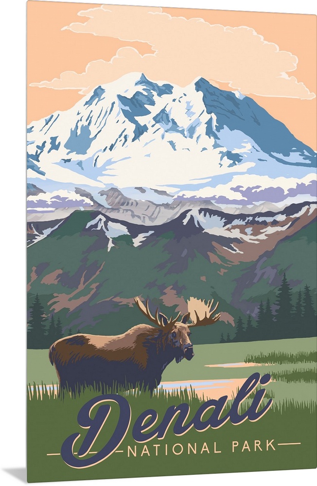Art Mountains Lantern Press United States Alaska Denali National Park Moose and Elk