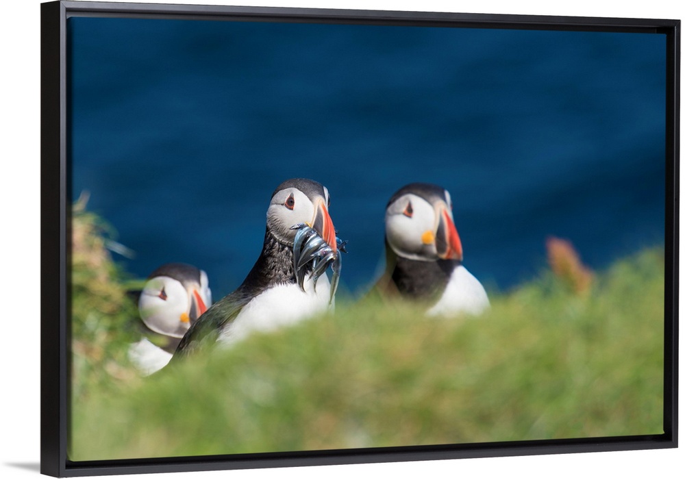 <p>Denmark, Faeroe Islands, Mykines, Scandinavia, Atlantic Puffins with catch in the beak.</p>