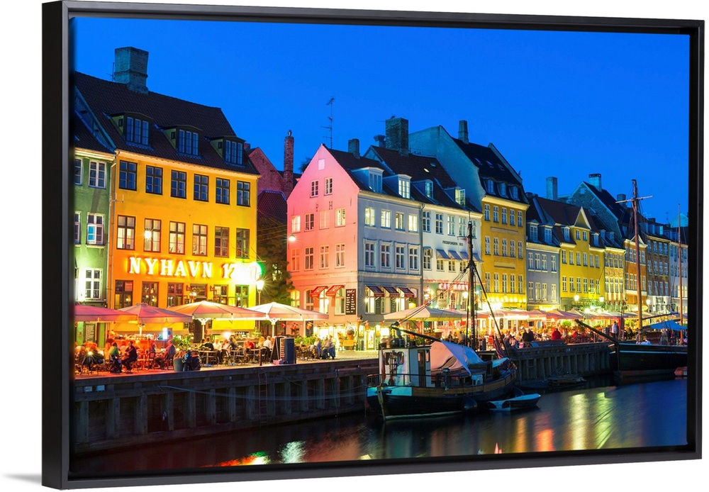 <p>Denmark, Hillerod, Copenhagen. Colourful buildings along the 17th century waterfront of Nyhavn at dusk.</p>