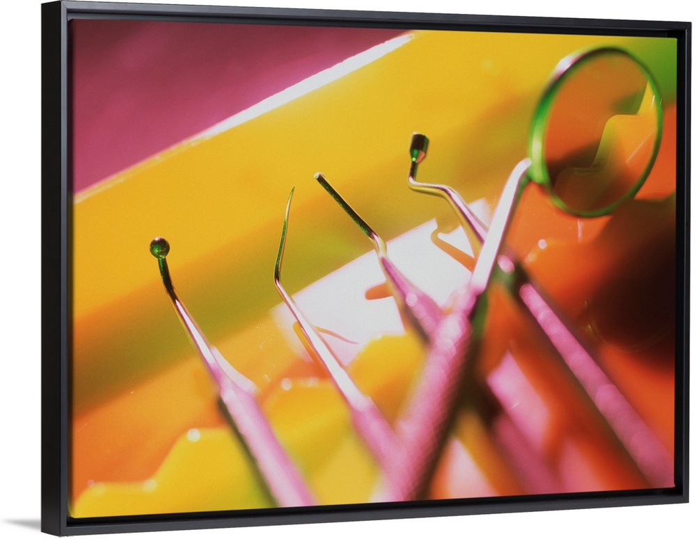 <p>Dentistry equipment. Selection of instruments used in a dental surgery, including an angled mirror (upper right) and a scraper (second from left).</p>