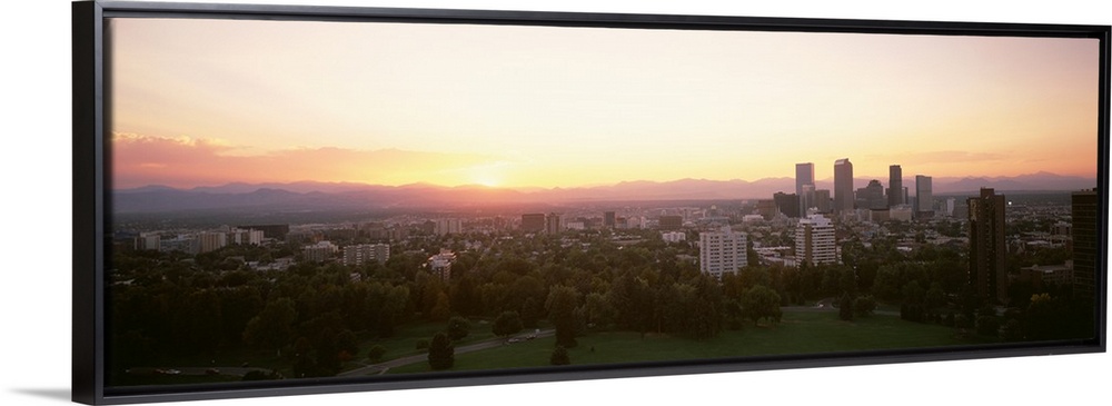<p>Panoramic photograph of the sunrise above the Denver, Colorado skyline and park.</p>