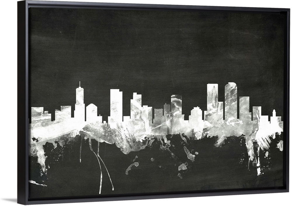 <p>Smokey dark watercolor silhouette of the Denver city skyline against chalkboard background.</p>