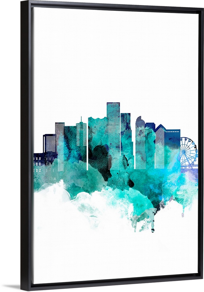<p>The Denver, Colorado city skyline in watercolor splashes made with shades of blue.</p>