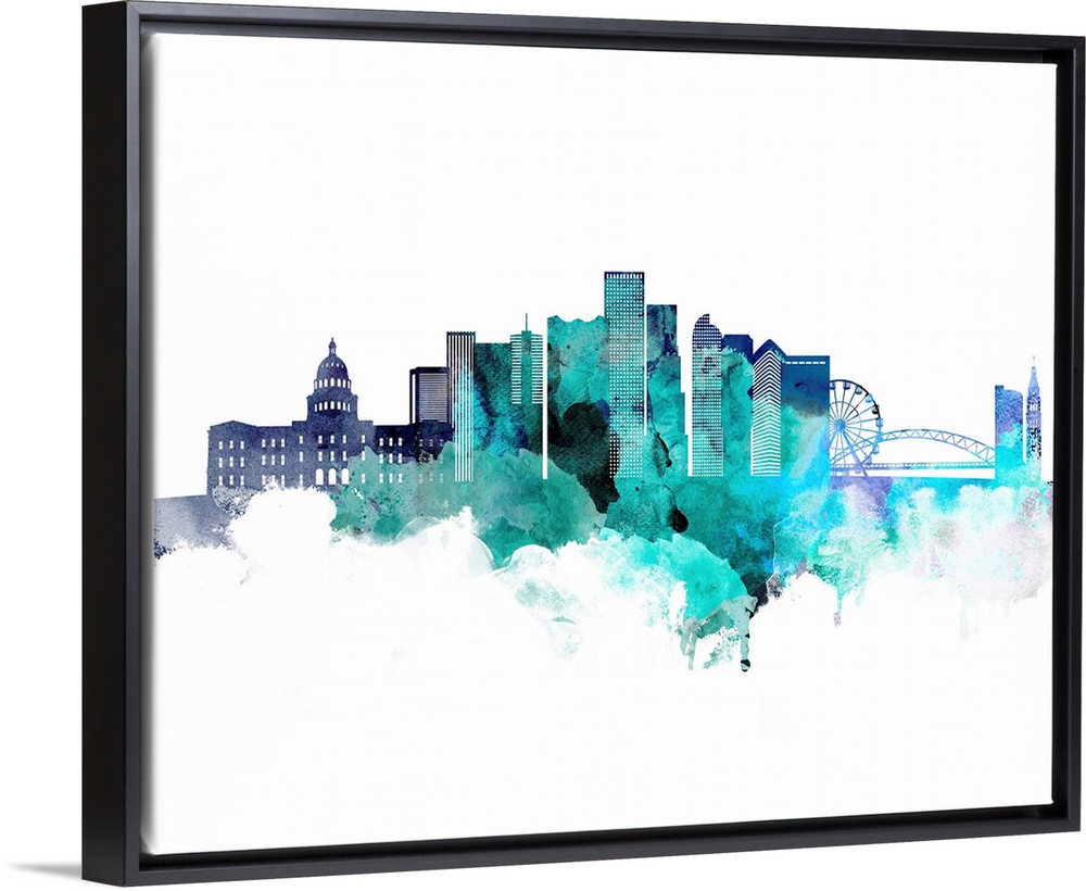 <p>The Denver, Colorado city skyline in watercolor splashes made with shades of blue.</p>