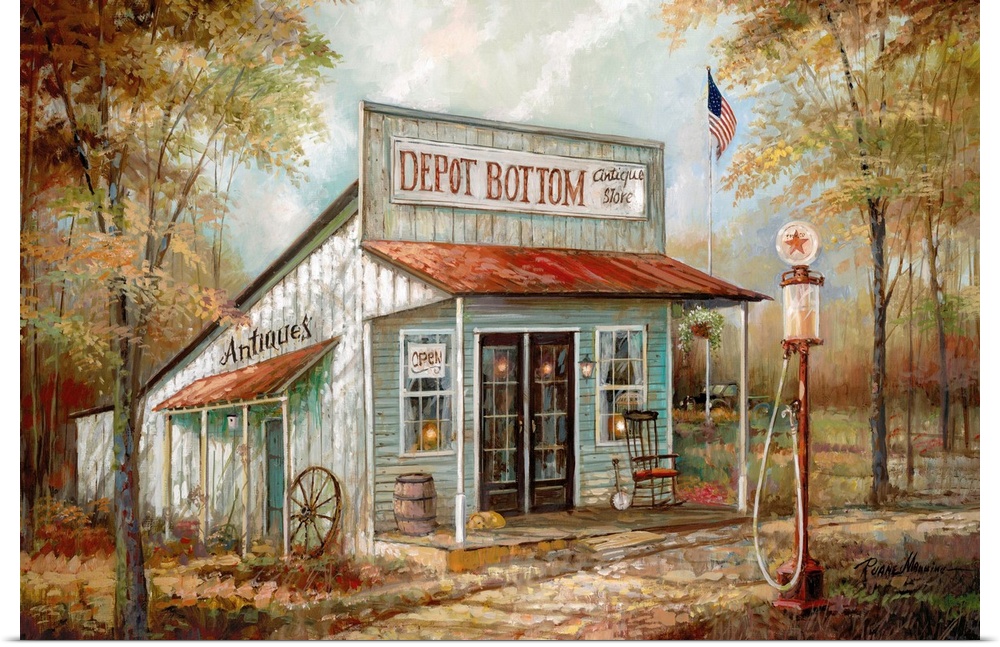 <p>Contemporary painting of a countryside antique store called "Depot Bottom" with Autumn trees surrounding it.</p>