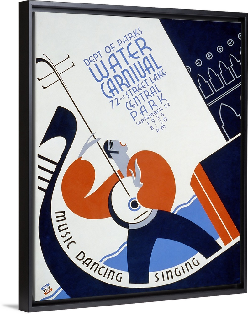 <p>Department of Parks Water Carnival. Music, dancing, singing. Poster announcing water carnival in Central Park, showing man standing in a gondola, playing stringed instrument, and singing. Library of Congress, Prints and Photographs Division, WPA Poster Collection.</p>