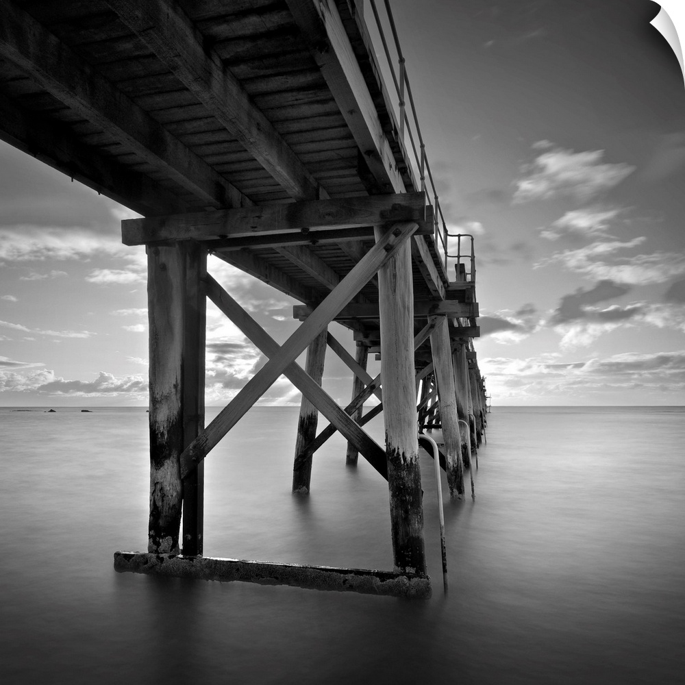 <p>A black and white photograph of a pier jetting out over the ocean.</p>