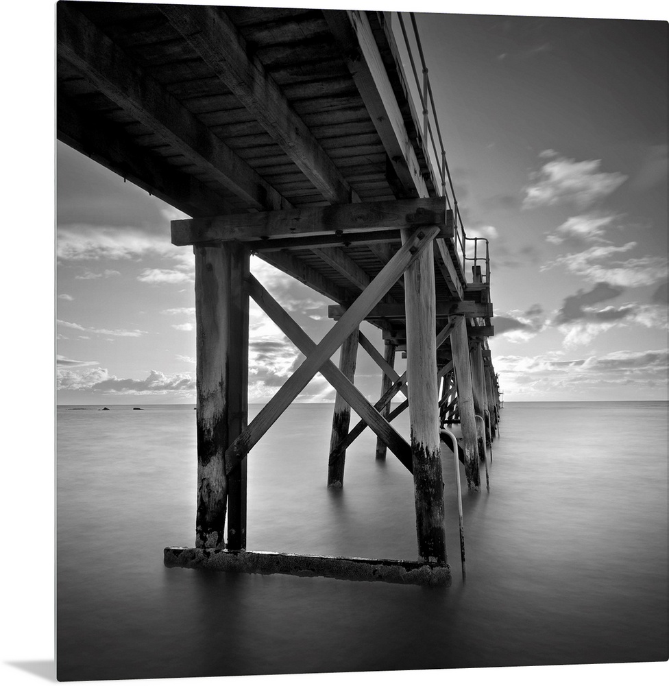 <p>A black and white photograph of a pier jetting out over the ocean.</p>
