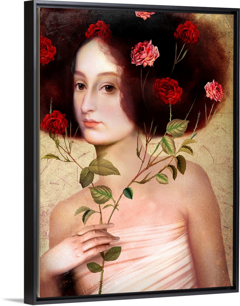 <p>A portrait of a lovely young lady holding a branch of roses that are intertwining through her hair.</p>