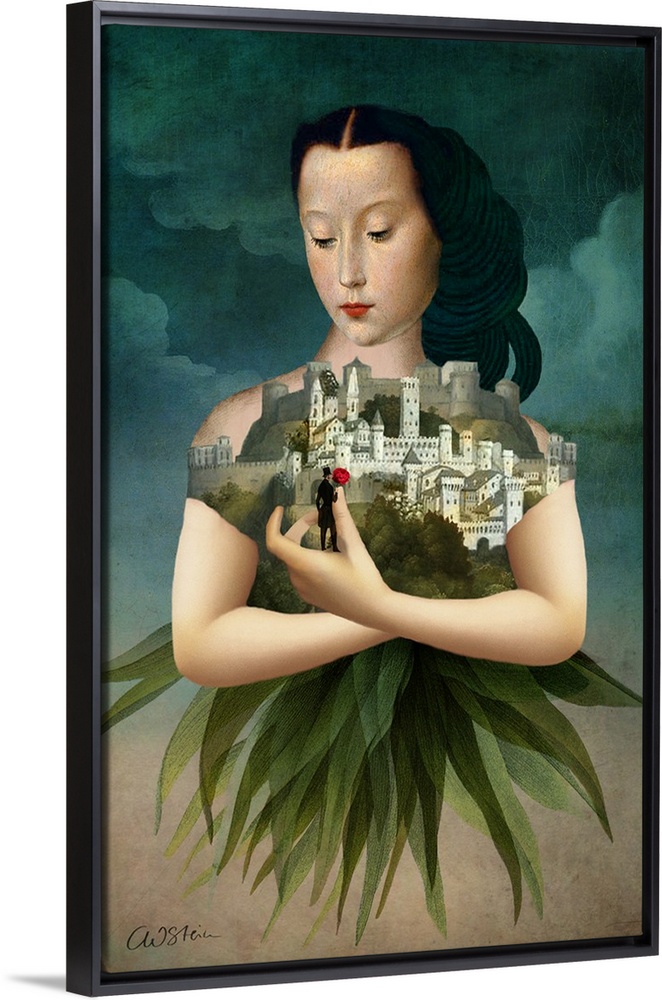 <p>A woman is hugging a village with a castle while holding a small man with a rose in her fingers.</p>