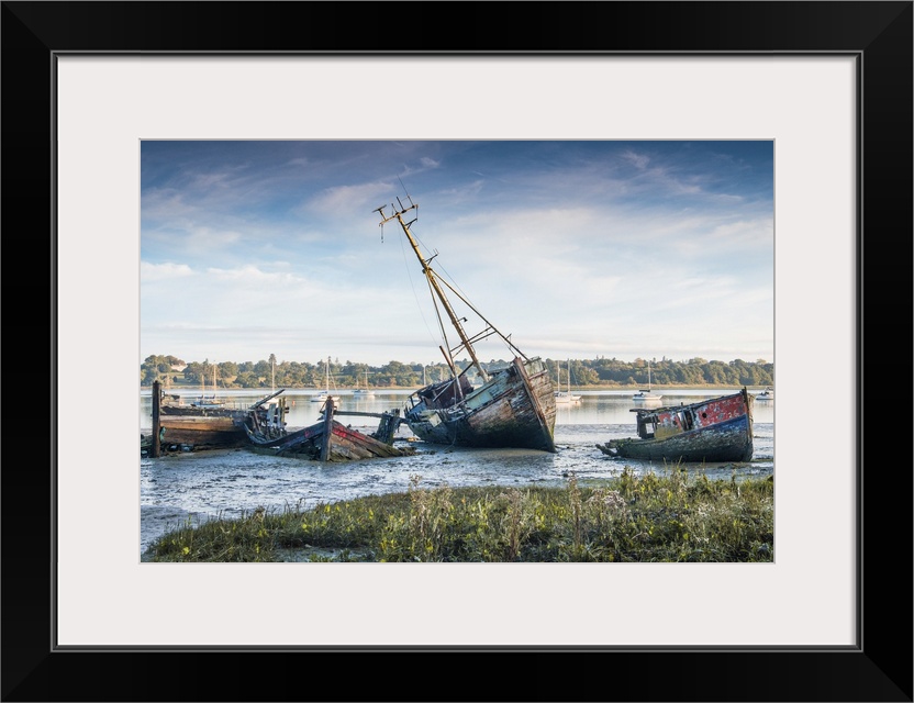 <p>Derelict boats rot on the mud at Pin Mill.</p>