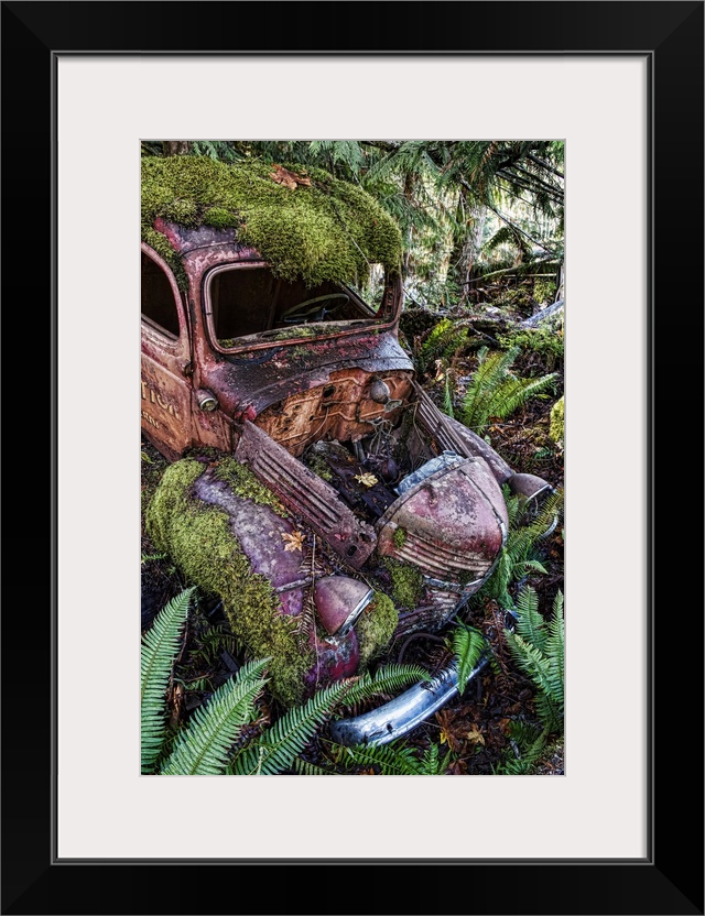 <p>Arty image of derelict motor car in a ditch overgrown with moss and ferns, Vancouver Island; British Columbia, Canada</p>