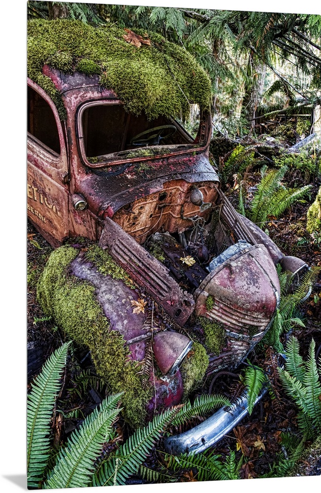 <p>Arty image of derelict motor car in a ditch overgrown with moss and ferns, Vancouver Island; British Columbia, Canada</p>