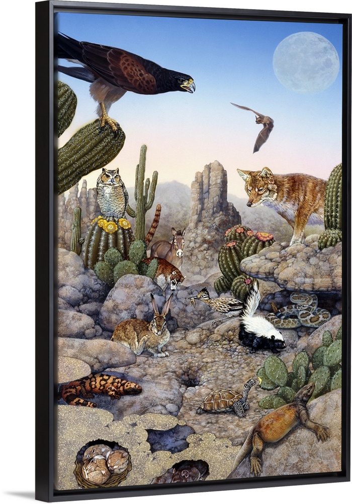 <p>Desert scene with falcon and cactus, a fox and other desert animals</p>