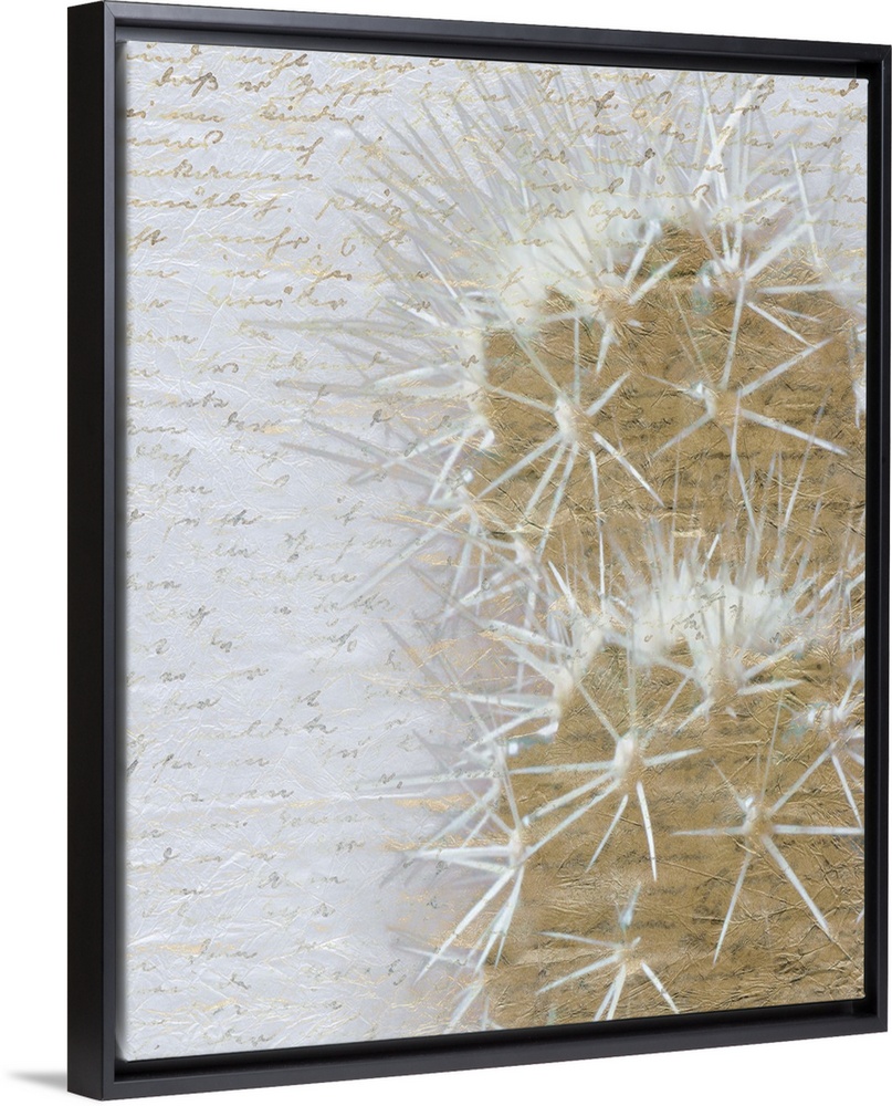 <p>Gold desert cactus on a white background with faint gold handwritten text.</p>