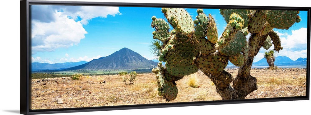 <p>Panoramic landscape photograph of a desert with mountains in the background and a big cactus in the foreground. From the Viva Mexico Panoramic Collection.</p>