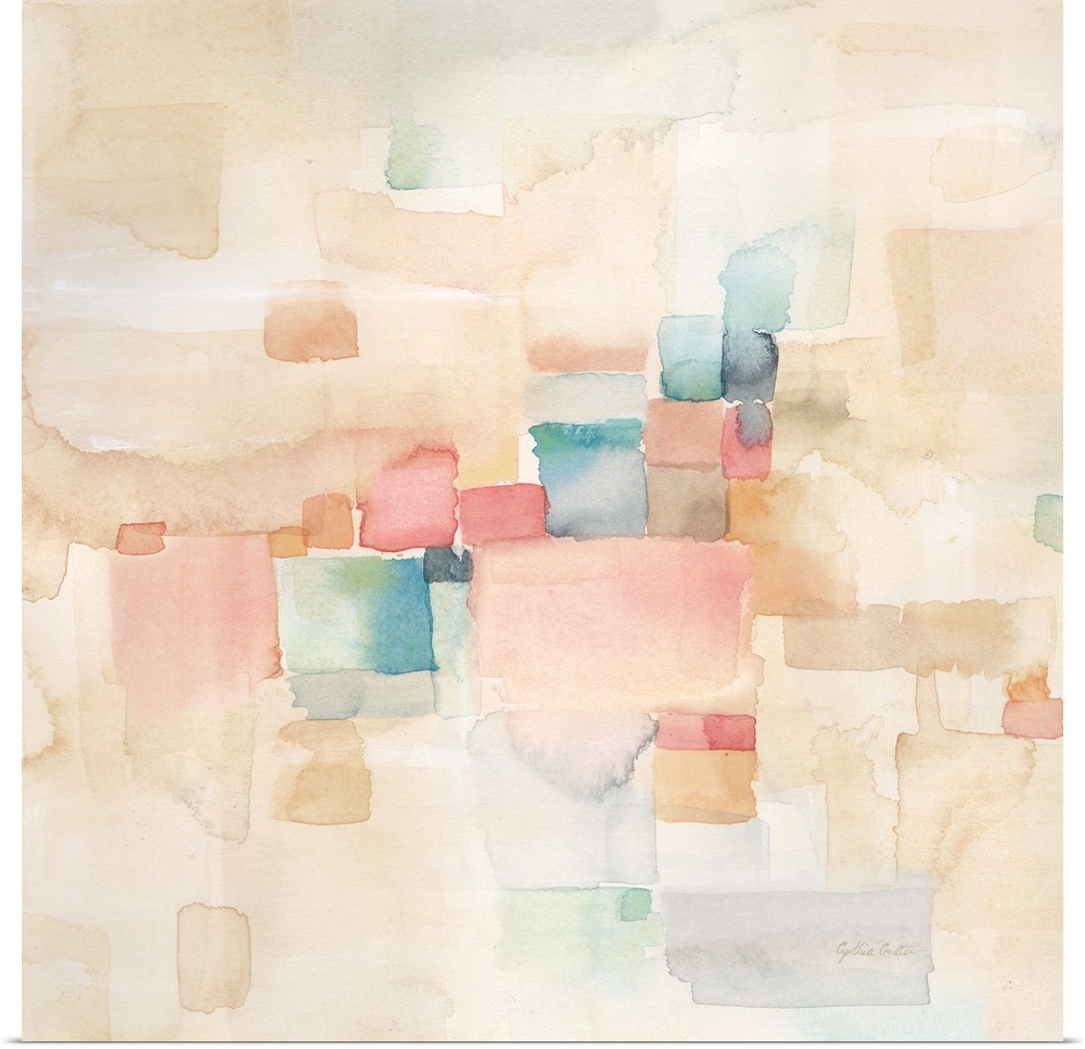 <p>Square abstract watercolor painting in blurred square shapes in muted tones of pink, blue and green.</p>