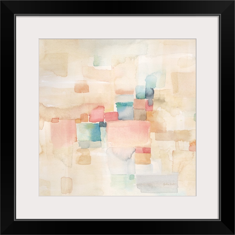 <p>Square abstract watercolor painting in blurred square shapes in muted tones of pink, blue and green.</p>
